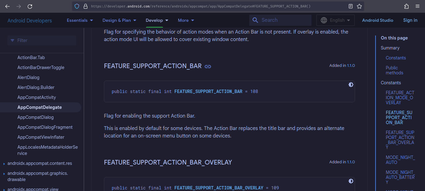 We see that valid_password is already declared inside it. A quick google and we can tell that AppCompatDelegate.FEATURE_SUPPORT_ACTION_BAR is a constant in the AppCompatDelegate class with value equaling 108.