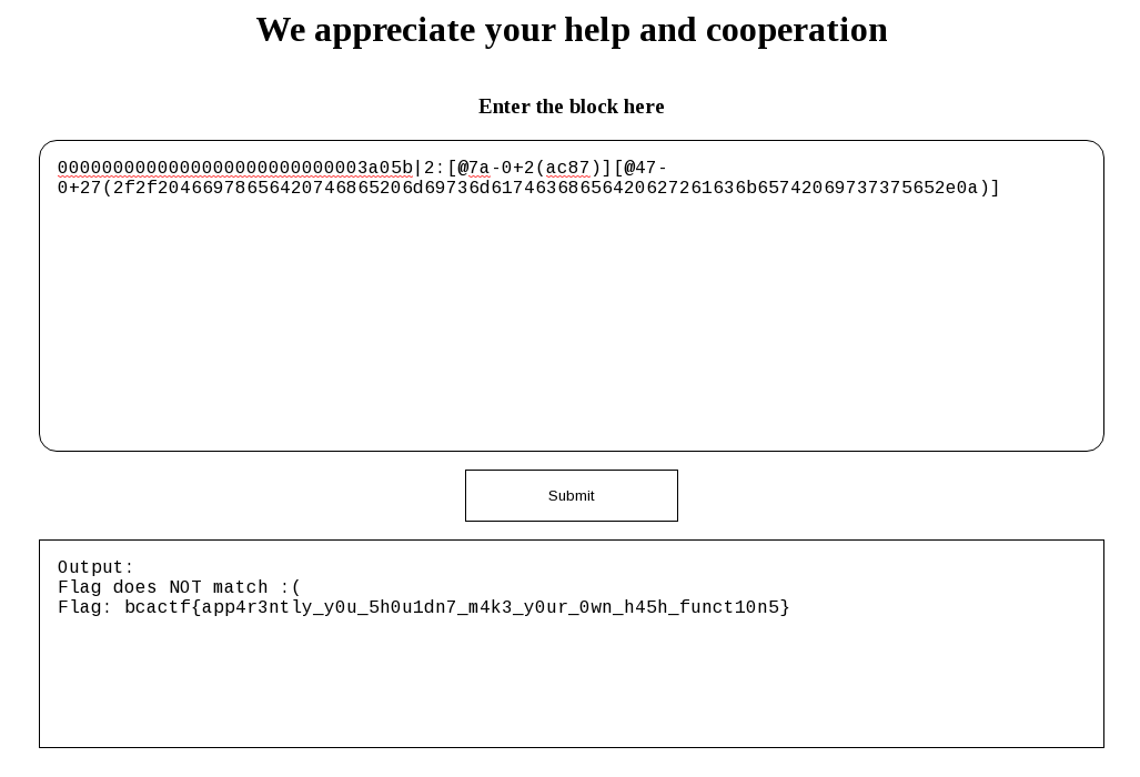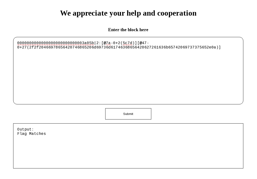 The webpage loads the response into the bottom textbox where we see the output for providing the lost block is Flag Matches. So the flag validator works as expected for the right input.